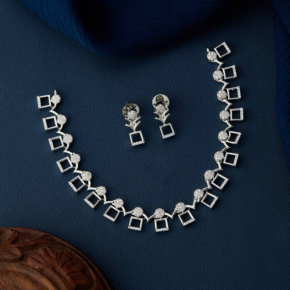 Designed with precision, this necklace set blends clean geometric squares with brilliant round-cut cubic zirconia stones, giving it a bold yet refined aesthetic. The silver rhodium finish adds lasting shine and durability, making it ideal for modern women who love a minimal yet statement look.